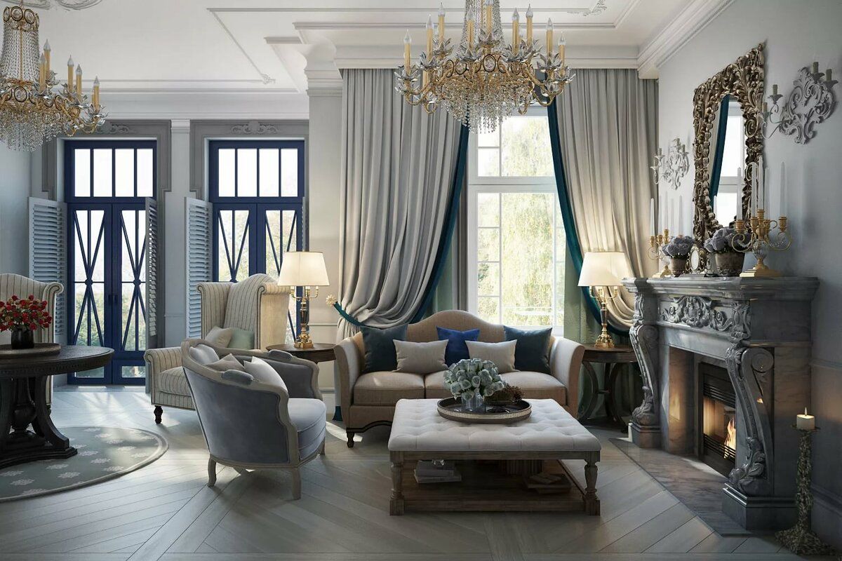 Для неоклассического стиля характерно обилие естественного и искусственного света. Главным источником освещения выступает массивная люстра, расположенная над центральным предметом мебели.