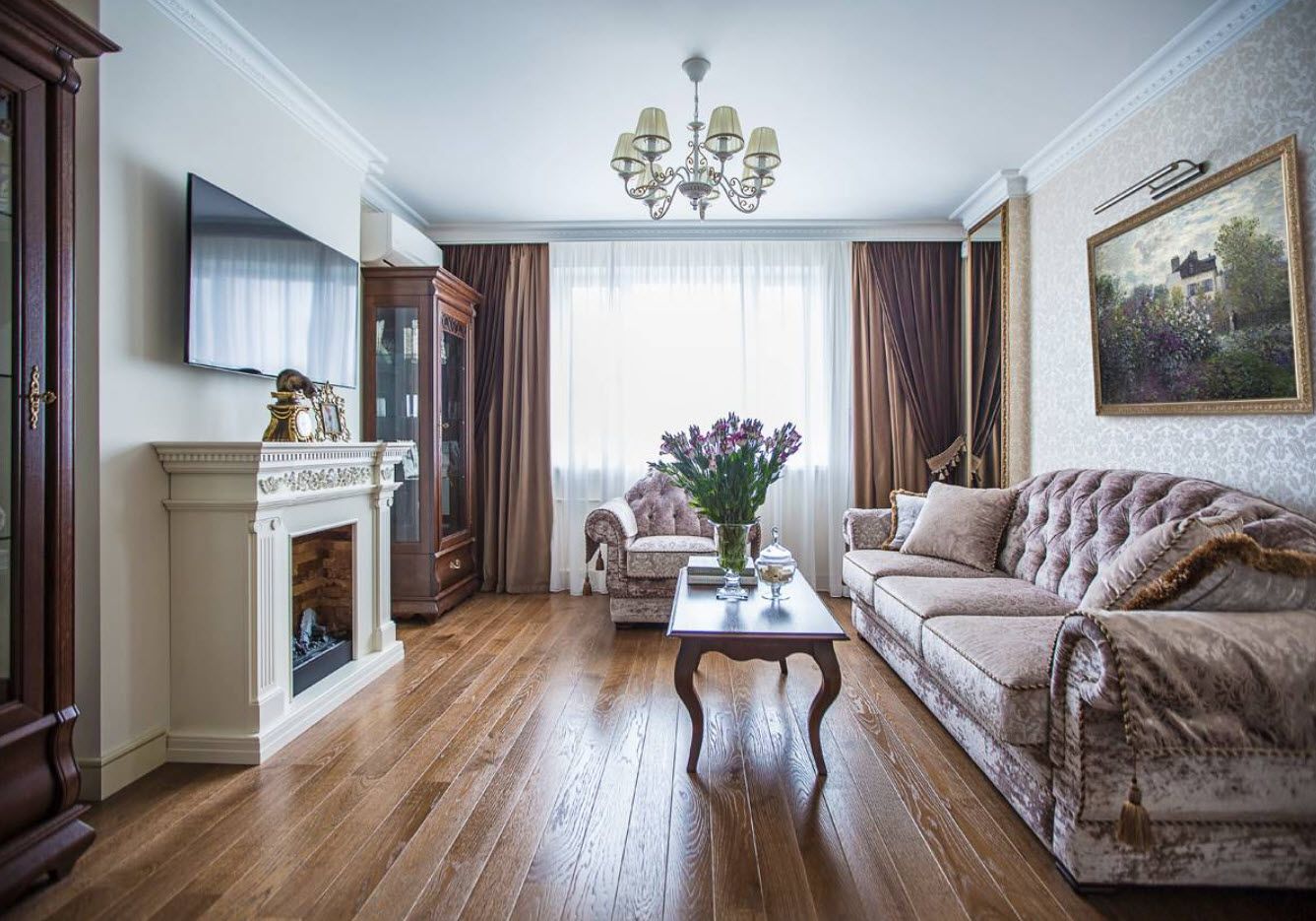 Оформляя зал в квартире в классическом стиле, уместно использовать различные аксессуары и дополнительный декор. Одним из ключевых элементов помещения может стать камин. Он внесет изюминку в интерьер, одновременно сделав его более уютным и комфортным.
