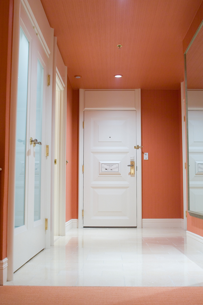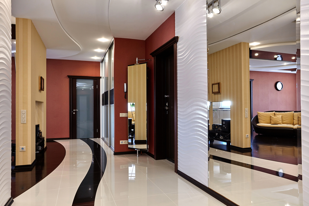 Вообще, узкие коридоры — это отдельный разговор. При помощи некоторых уловок можно добиться эффекта расширения пространства. Например, при достаточной высоте потолков, в узком коридоре примерно посередине стены можно сделать полосу другого цвета. Этот прием позволяет «развалить» стены в стороны. Эффект увеличивается, если на противоположной стене есть большое зеркало или зеркальные дверцы шкафа.