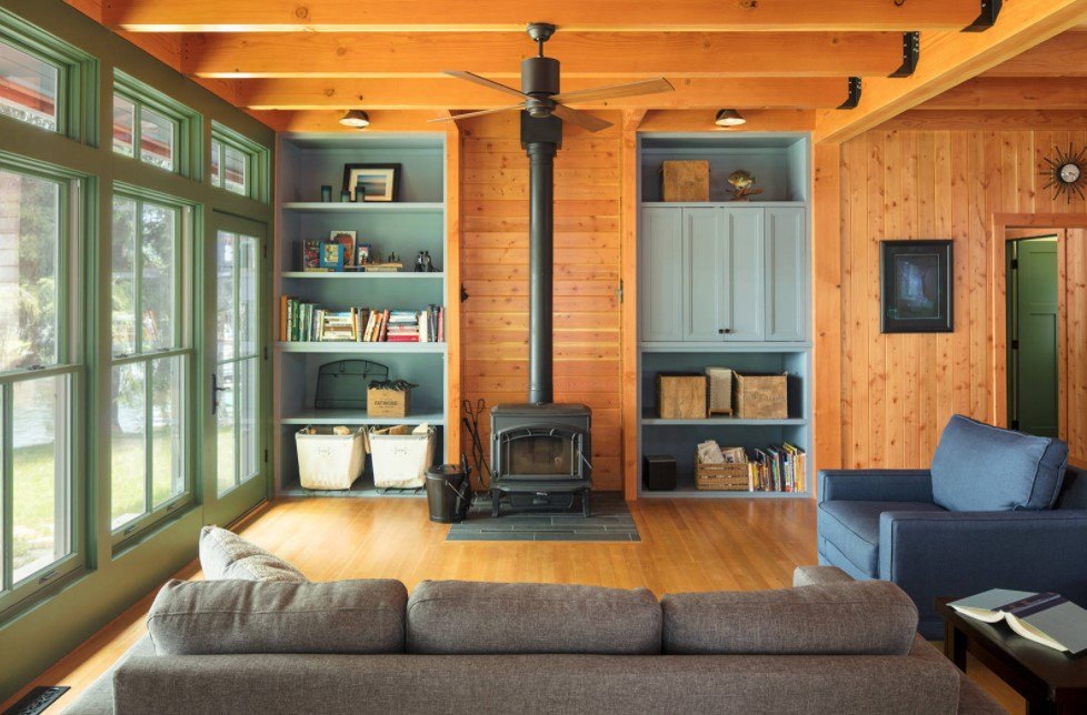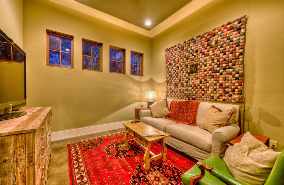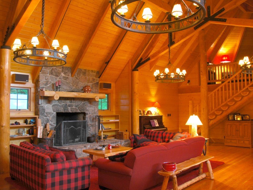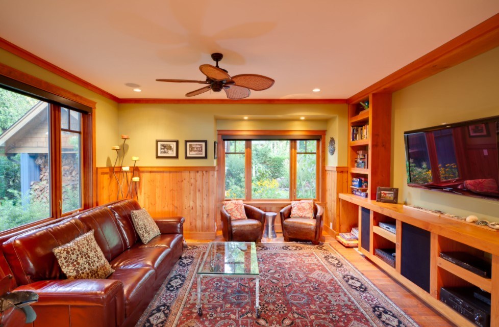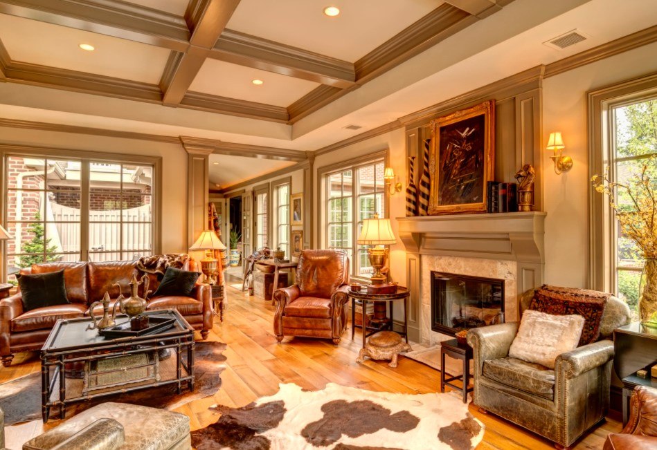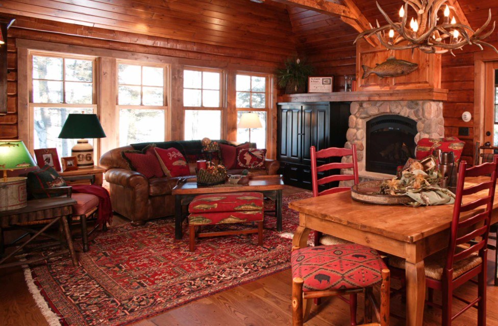 Кантри характеризуется применением конструкций из естественных материалов – древесины или зеленых растений. В него хорошо вписываются клетчатый плед на диване, напольный коврик, хлопковая, шерстяная или льняная ткань.