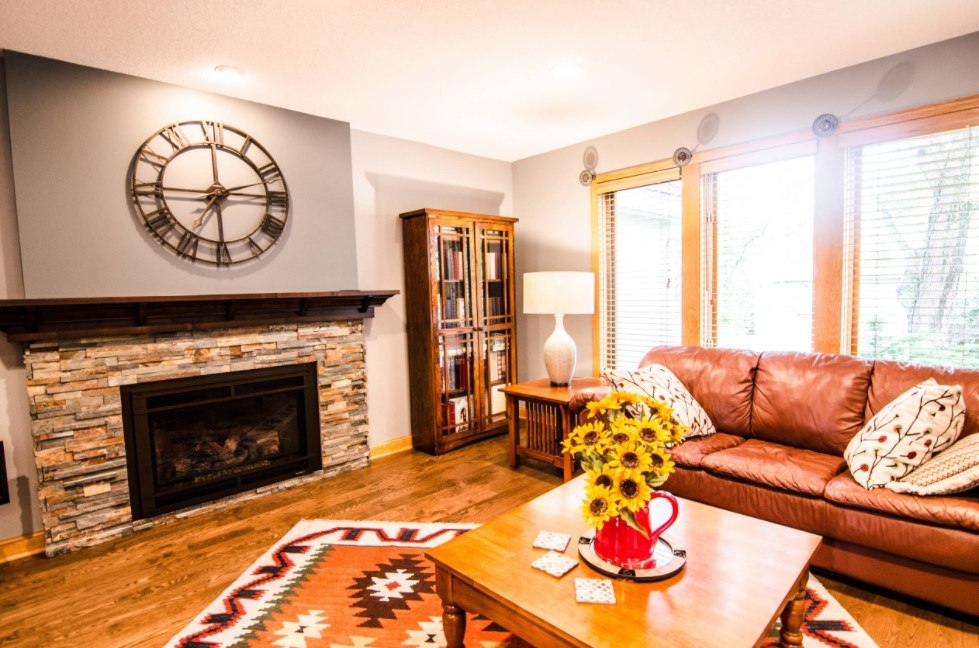Такой вариант цветового сочетания больше остальных привносит в интерьер уют и тепло. Оранжевый цвет прекрасно сочетается со светлым деревом, поэтому в таком дизайне минимум шансов переборщить и сделать комнату аляповатой. Такое сочетание вписывается во многие стили, а также хорошо в таком интерьере выглядит акцентный мебельный гарнитур со светло-бежевыми стенами.